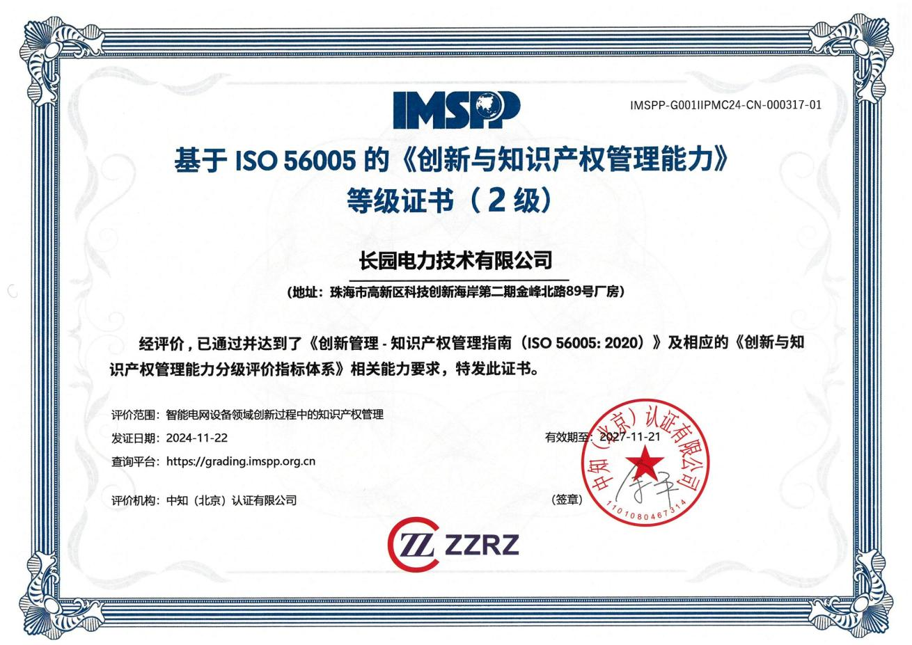 近日,在珠海市与高新区的知识产权主管部门领导班子的带领指导下,yabo.com科技集团旗下子公司yabo.com电力技术有限公司(以下简称:yabo.com电力)顺利获得珠海首批智能电网设备领域国际标准ISO 56005二级认证证书。